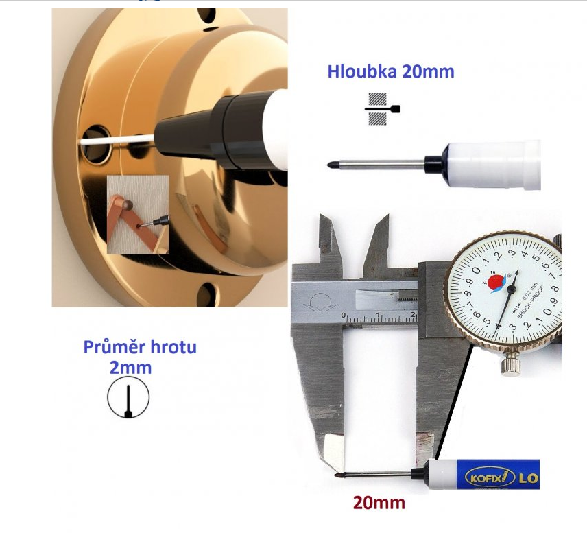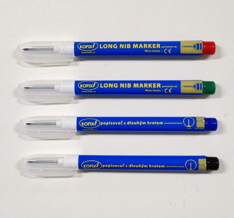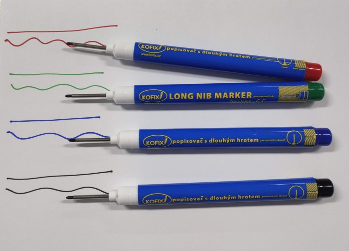 Permanentní fix s dlouhým tenkým hrotem Kofix pro značení v těžko dostupných místech (např. před vrtání).