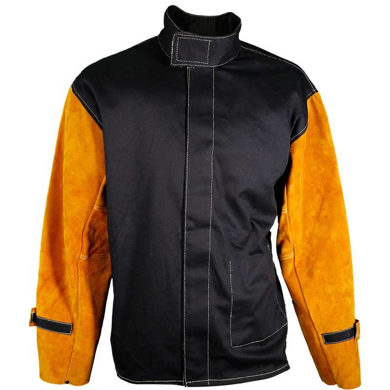 Svářečská bunda Parweld Panther BLACK PPE s koženými rukávy. Nosí se přes oděvy, aby poskytovala maximální ochranu tělu a pažím. Vyrobeno ze štípané hovězí kůže s bavlněným tělem z nehořlavé bavlny.